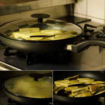 - 茄子を縦8割りにして、食べやすい長さにカットする。